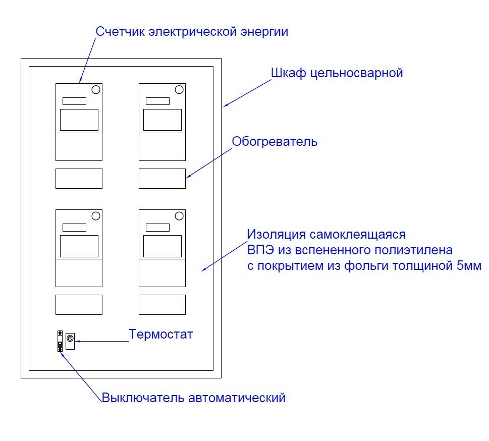 Все типы комплектных трансформаторных подстанций, при желании заказчика, оборудуются шкафом учета и автоматики с обогревом для эксплуатации оборудования в условиях низких температур. Шкаф разрабатывается в различных габаритах в зависимости от количества оборудования и расположения шкафа в КТП. Поддержание требуемой температуры воздуха в шкафу – автоматическое.